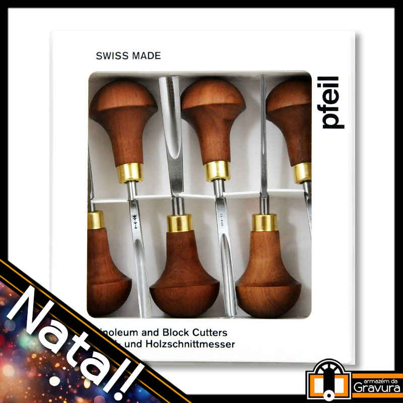 Jogo de 6 ferramentas Pfeil com cabo pêra (série L, em torno de 13 cm inteira) ideal para todas as técnicas de gravura em relevo (xilogravura, linoleogravura, etc), entalhe, escultura, dentre outras técnicas, com suporte de madeira.