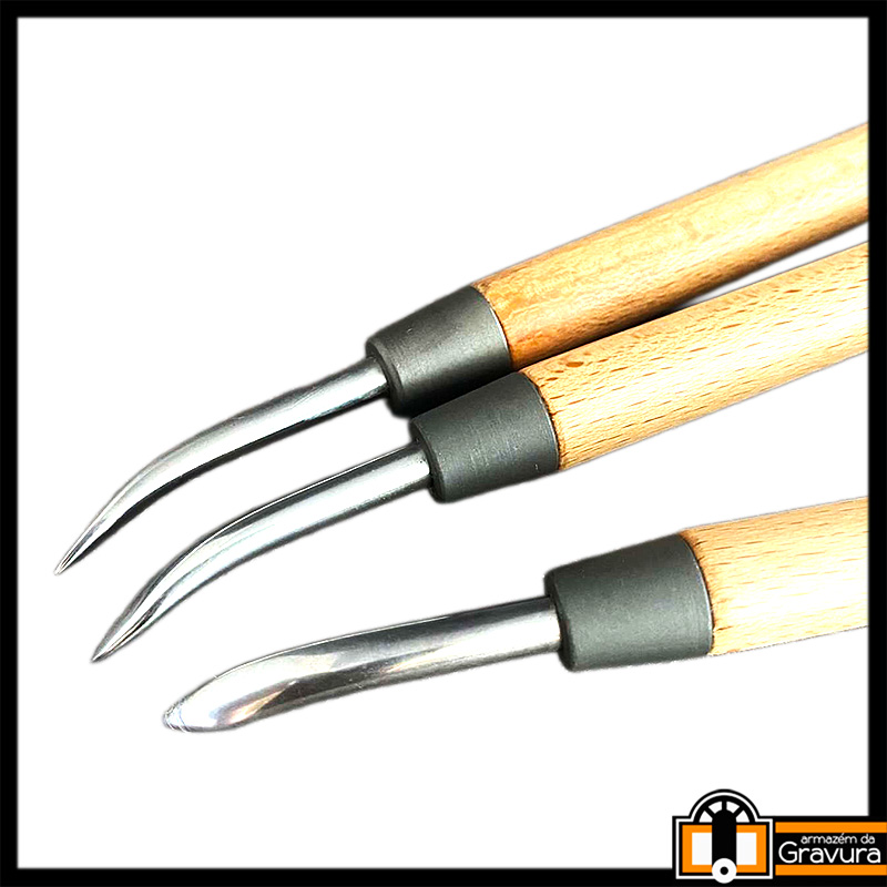 Disponível em dois tamanhos, este brunidor serve, na gravura em metal, como uma espécie de "borracha": friccionando a parte arredondada da ferramenta na placa, conseguimos achatar rebarbas e "apagar" riscos e pequenas gravações dentre outras interferências.